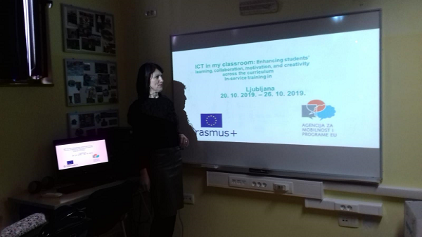U četvrtak, 19. prosinca 2019. godine, na drugoj sjednici Učiteljskog vijeća, za 36 nazočnih, sudionice mobilnosti Marijana Kandić, učiteljica Hrvatskog jezika, Marija Mrkić, učiteljica Geografije i Jasminka Adžić-Sikirić, učiteljica Hrvatskog jezika održale su kratko predstavljanje tečaja i sadržaja kojima su se bavili polaznici njihovih mobilnosti. S ciljem davanja uvida prisutnim kolegama, prezentirane su pozitivne strane ovakvog oblika profesionalnog usavršavanja, te su pojašnjeni osnovni koncepti njihovih tečajeva.