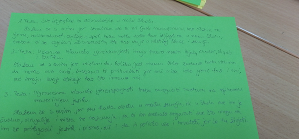 Na prvom satu predstavljen je projekt i tečaj koji su pohađale - Managing a diverse classroom: Facing Upcoming Challenges. Na drugom satu je održana radionica Suočavanje s izazovima današnjice. Na radionici su postavljene tri teze. Učenici su bili aktivni, vodili su dinamičnu raspravu te su zajedno došli do određenih zaključaka vezanih za temu (prihvaćanje različitosti i inkluzija). Kroz radionicu smo došli do zaključka kako su naši učenici zreli sudionici i nositelji tolerantnog društva te su spremni prihvatiti učenike migrante, različitih kultura, svjetonazora i vjeroispovjesti u svoj razred i pomoći im u prilagodbi.