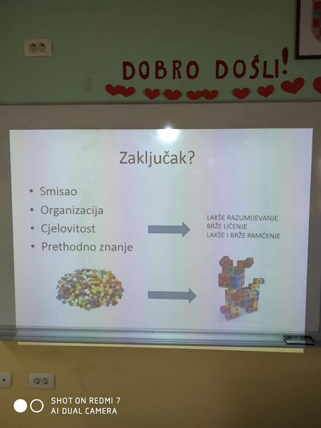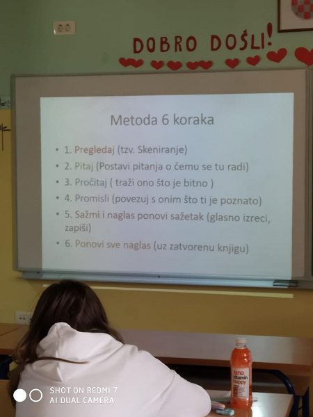 U sklopu kolegijalnog promatranja nastavnica Engleskog jezika Nina Lonić prisustvovala je satu knjižničarke Marijane Pavić u 6.c razredu. Tema sata je bila ,,Kako brže, bolje i lakše učiti.'' Knjižničarka je na jednostavan i učenicima prikladan način objasnila što znači učenje s razumijevanjem te primjerima pokazala neke od strategija pamćenja kao što je metoda šest koraka koja učenicima može uvelike olakšati učenje. Takve strategije su korisne u nastavi stranog jezika kod reprodukcije i prepričavanja teksta, učenja nepoznatih riječi i izraza te jezičnih zakonitosti.