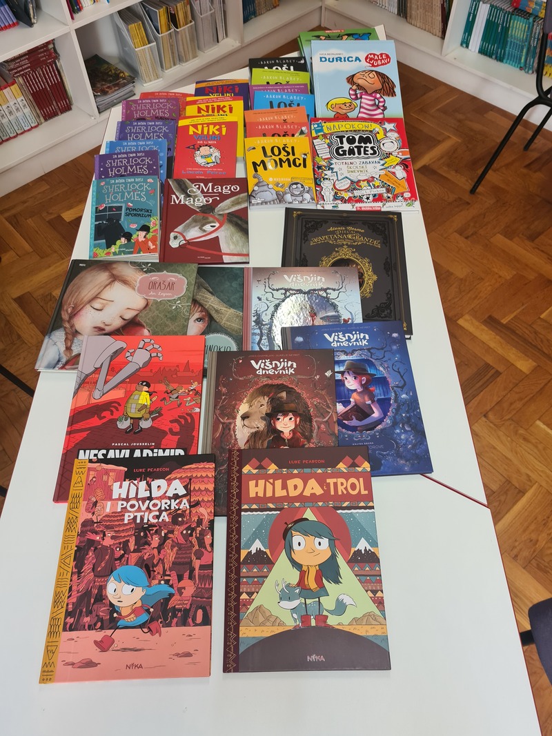 Zahvaljujući donacijama svih razreda obogatili smo police knjižnice novim zanimljivim i suvremenim naslovima, malo popunili lektirni fond i privukli još veći broj korisnika koji svakodnevno traže popularne naslove. Ovaj put nabava je bila u znaku kvalitetnih i popularnih stripova i grafičkih romana za čitanje u slobodno vrijeme. Vjerujemo da će svaki učenik na policama naše školske knjižnice naći nešto zanimljivo, bilo staro ili novo, što će ga oplemeniti, zainteresirati i zabaviti!