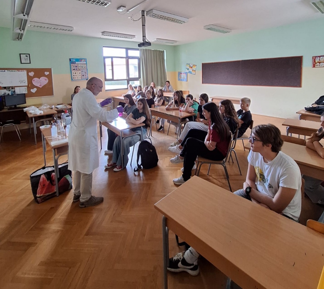 13.5. U našoj školi imali smo predstavljanje Prirodoslovno-grafičke škole, novog smjera Prirodoslovne gimnazije. Njihov prof.kemije Edo Končurat napravio je niz kemijskih pokusa zainteresiranim učenicima osmih razreda.