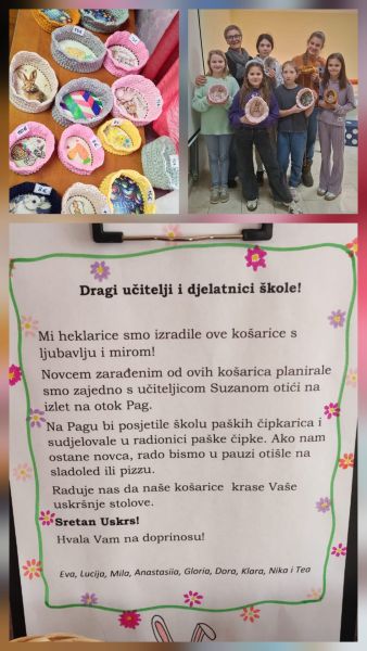Učiteljica Suzana Jurin je tijekom ožujka, zajedno s grupom učenica 5. i 6. razreda, provela STEM projekt „Matematička nit“ koji povezuje matematiku, umjetnost, kulturnu baštinu i poduzetništvo. Učenice su pokazale da se matematika ne nalazi samo u udžbenicima, već i u svakom bodu heklane niti. Kroz kreativne radionice, učenice su primijenile poznavanje geometrije kruga, nizova i algoritama za izradu unikatnih uskršnjih košarica.
