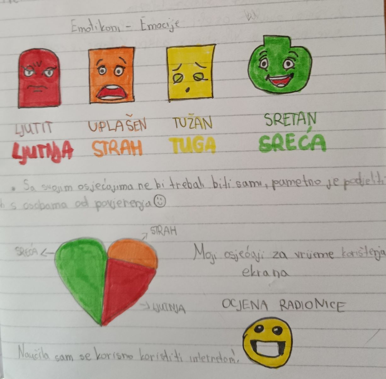 Osnovne emocije koje se javljaju kod većine učenika su sreća, ljutnja, strah i tuga. Tijekom radionice učenicima je skrenuta pozornost na portal netica.hr gdje mogu dobiti mnoštvo informacija i odgovora na pitanja koja ih muče. Učenici su se slikovno izrazili koje emocije se javljaju kod njih odnosno u kojoj mjeri su zastupljene emocije sreće, tuge, ljutnje i straha.