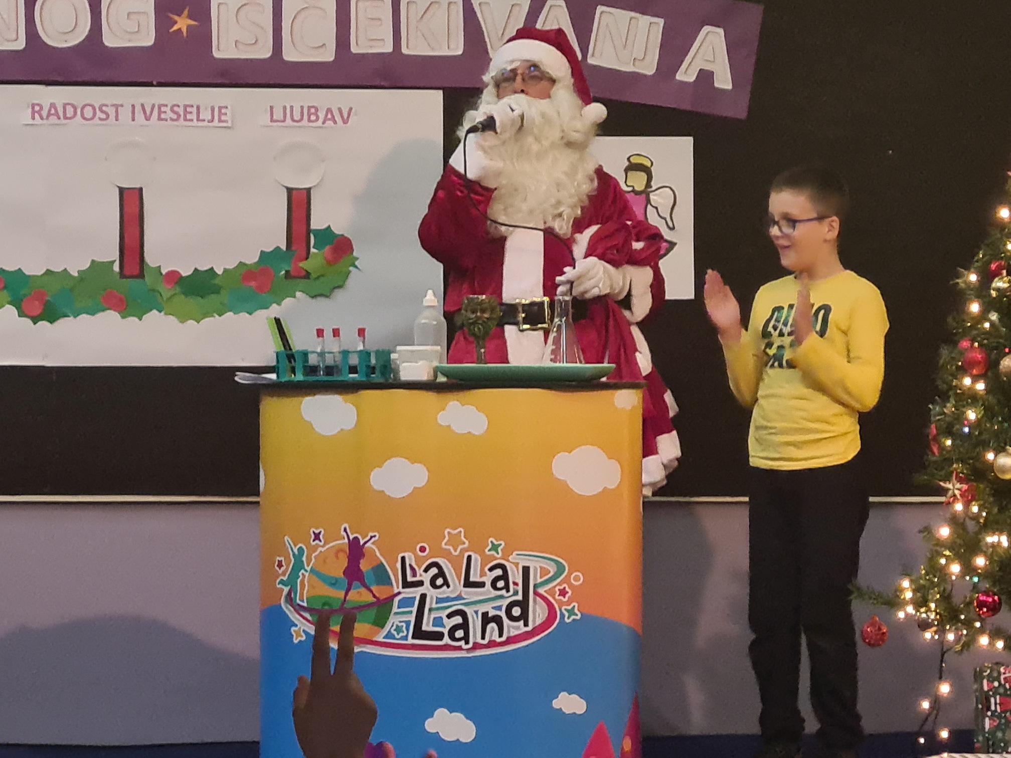 Učenici razredne nastave uživali su u interaktivnoj predstavi Dan u laboratoriju Djeda Mraza koju je izveo mladi glumac i poznati tik-toker Miro Čabraja, voditelj putujućeg kazališta La-la land.