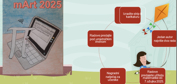 I ove godine učenici naše škole sudjeluju u etwinning projektu Matematika kroz strip i karikaturu mArt 2025. U projekt se mogu uključiti svi učenici nižih i viših razreda naše škole. Dovoljno je da nacrtaju neki matematički strip ili karikaturu nekog znanstvenika i svoj rad predaju učiteljici matematike. Više o natječaju možete pronaći na mArt2025 nagradni natjecaj.docx