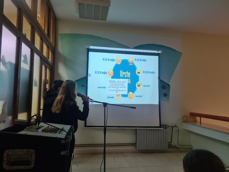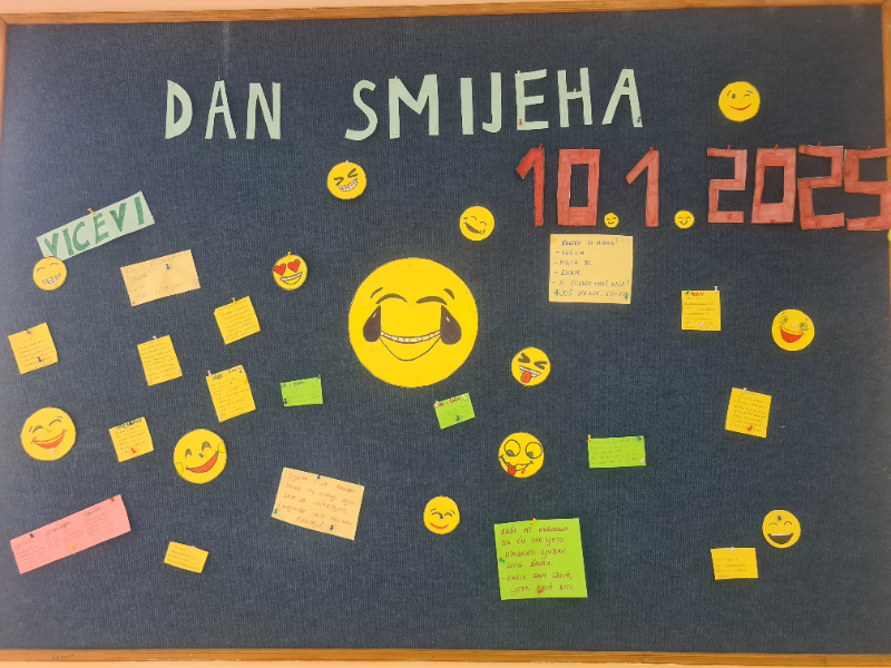 Te i još mnoge činjenice i izreke o smijehu saznali su učenici petih i šestih razreda koji su se okupili ispred školske knjižnice na Svjetski dan smijeha kako bi pričali viceve i dan obilježili iskrenim i radosnim smijehom. Vicevi su se pričali i u razredima, u sklopu svih nastavnih predmeta, a učenici 7. b razreda osmislili su i izradili školski pano posvećen Danu smijeha. Želimo da naša škola odzvanja radosnim smijehom svakoga dana i da svakoga dana svaki učenik i učitelj ima priliku i razlog za smijeh i sreću.