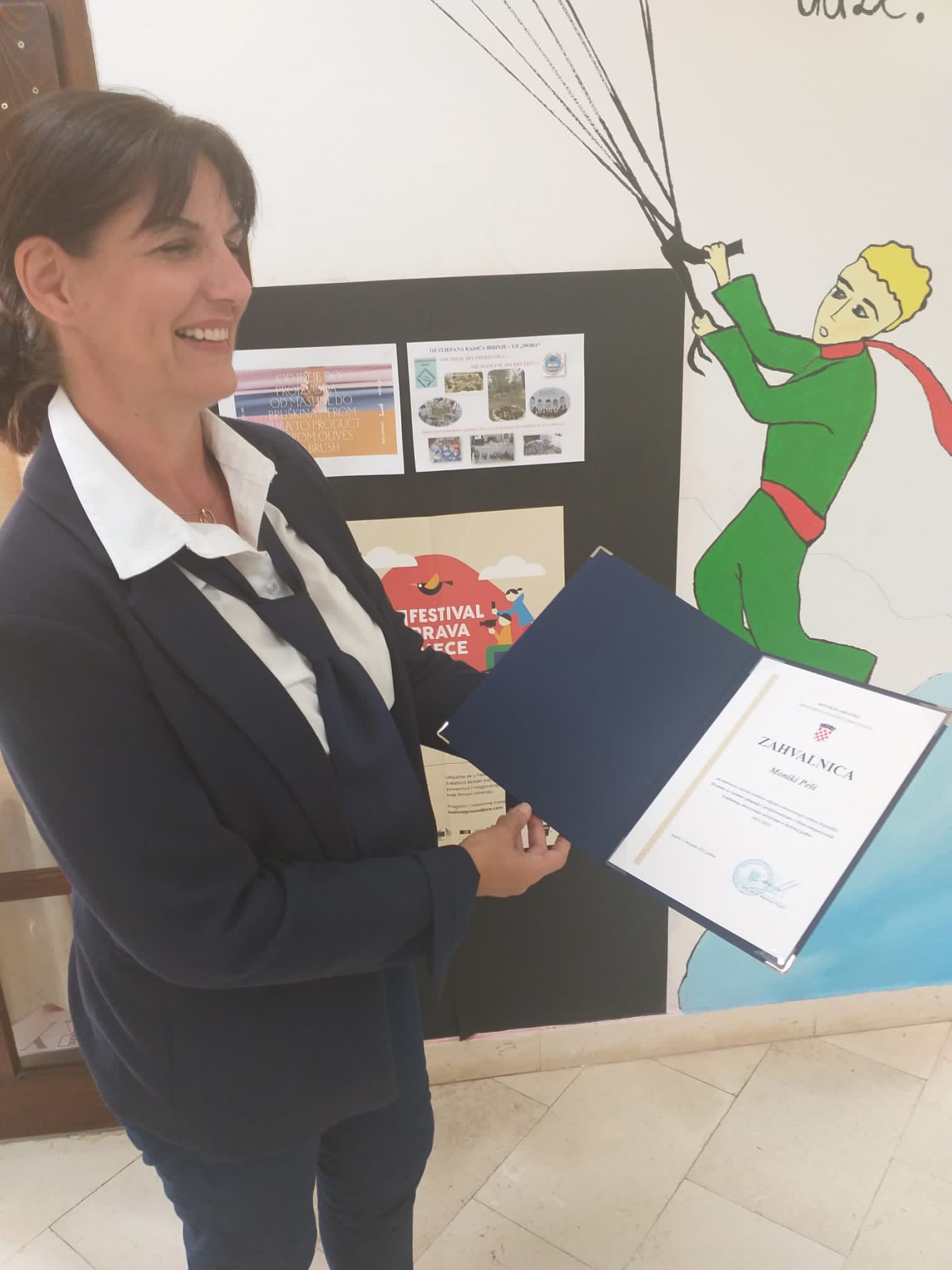 Ravnateljica je uručila dugogodišnjoj učiteljici Matematike, prof. Moniki Peša državnu nagradu za najboljeg učitelja.Monika Peša je učitelj savjetnik, voditeljica županijskog stručnog vijeća učitelja Matematike.