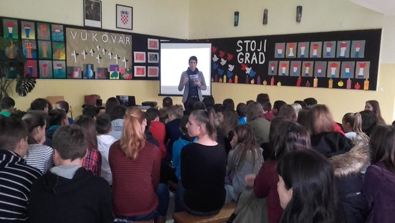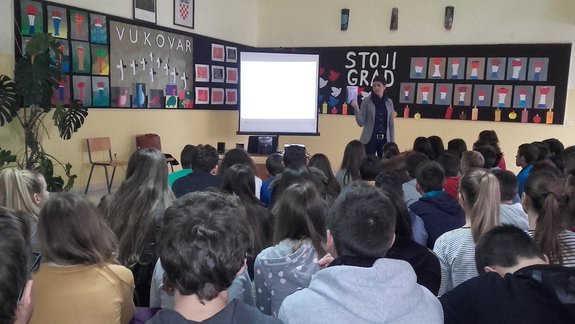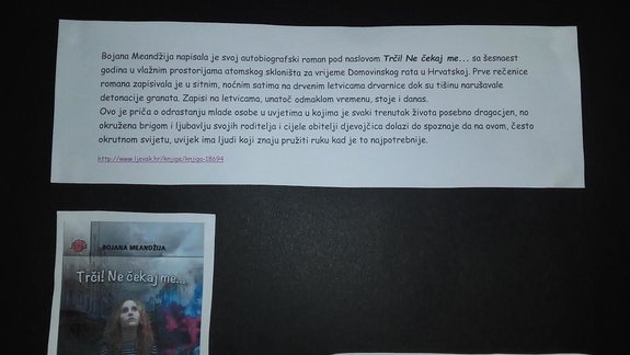 Danas nam je školu posjetila književnica Bojana Meandžija. Učenici 7 i 8 razreda slušali su o nastajanju njenog autobiografskog romana "Trči! Ne čekaj me" koji je napisala sa šesnaest godina u vlažnim prostorijama atomskog skloništa za vrijeme Domovinskog rata u Hrvatskoj.
